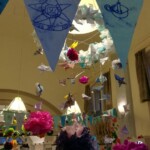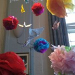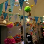I also went to the opening of a community art project at the Heritage Centre in Nuneaton.  This was the brainchild of many but the two artists who collaborated were Zara Day and Alisha Miller. It was then worked on by many ranging from the Escape Art Group, In Stitches sewing group to local schools and volunteers to make it come alive. I myself worked on parts of the giant tablecloth and napkins, chandeliers and the giant paper flowers. However due to work commitments I could not help in the final stages. This was a shame… but I then got to enjoy the wonderful wonder which hit me as I walked into the colourful room, it was a feast for the eyes.